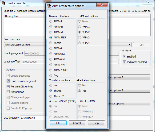在“ARM 架构选项”对话框中,我设置了: